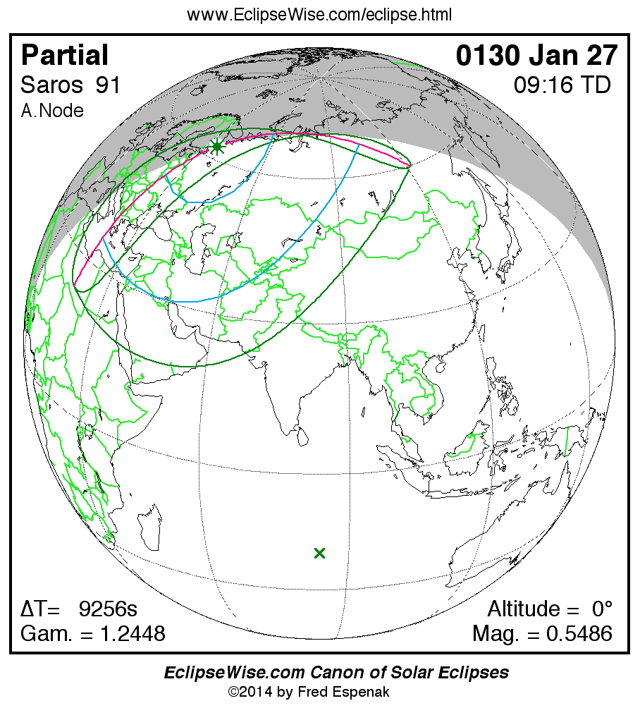 The instant of greatest eclipse takes place on 0130 Jan 27 at 09:15:41 TD (06:41:26 UT1).