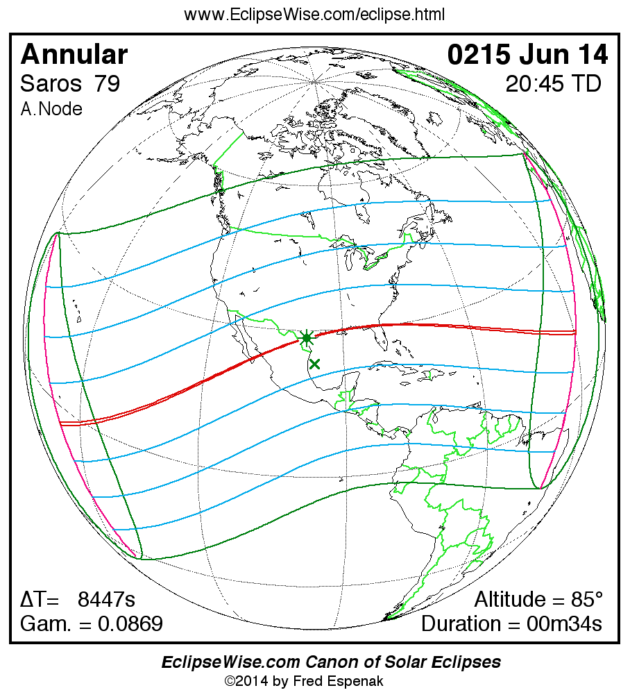 The instant of greatest eclipse takes place on 0215 Jun 14 at 20:45:05 TD (18:24:20 UT1).