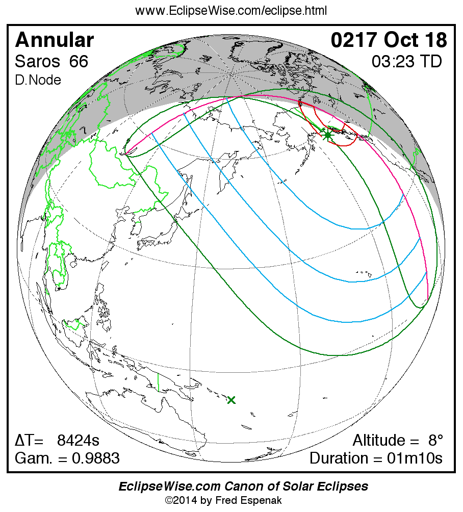 The instant of greatest eclipse takes place on 0217 Oct 18 at 03:23:04 TD (01:02:41 UT1).