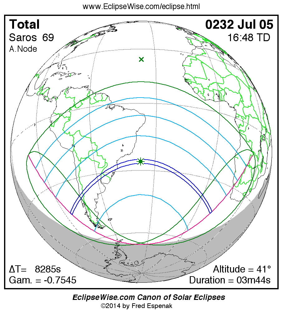 The instant of greatest eclipse takes place on 0232 Jul 05 at 16:47:39 TD (14:29:36 UT1).