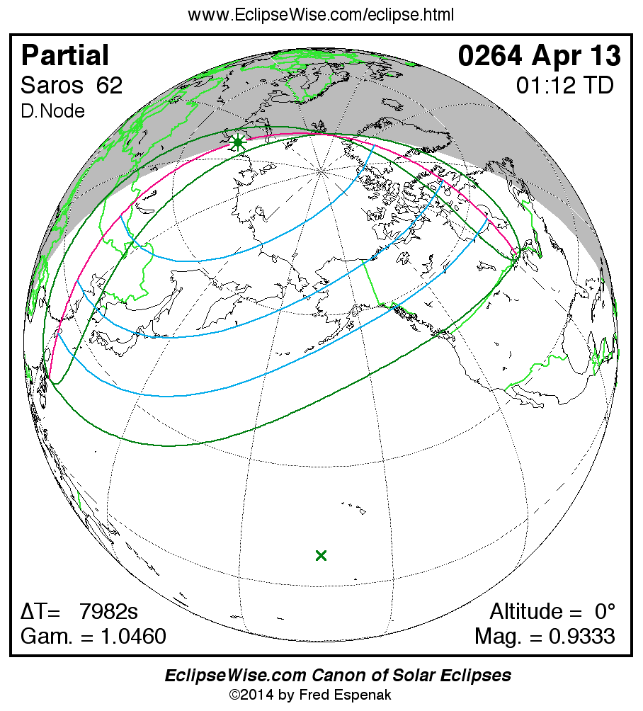The instant of greatest eclipse takes place on 0264 Apr 14 at 01:12:03 TD (22:59:02 UT1).