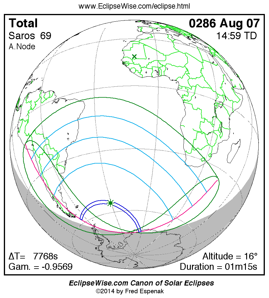The instant of greatest eclipse takes place on 0286 Aug 07 at 14:59:14 TD (12:49:47 UT1).