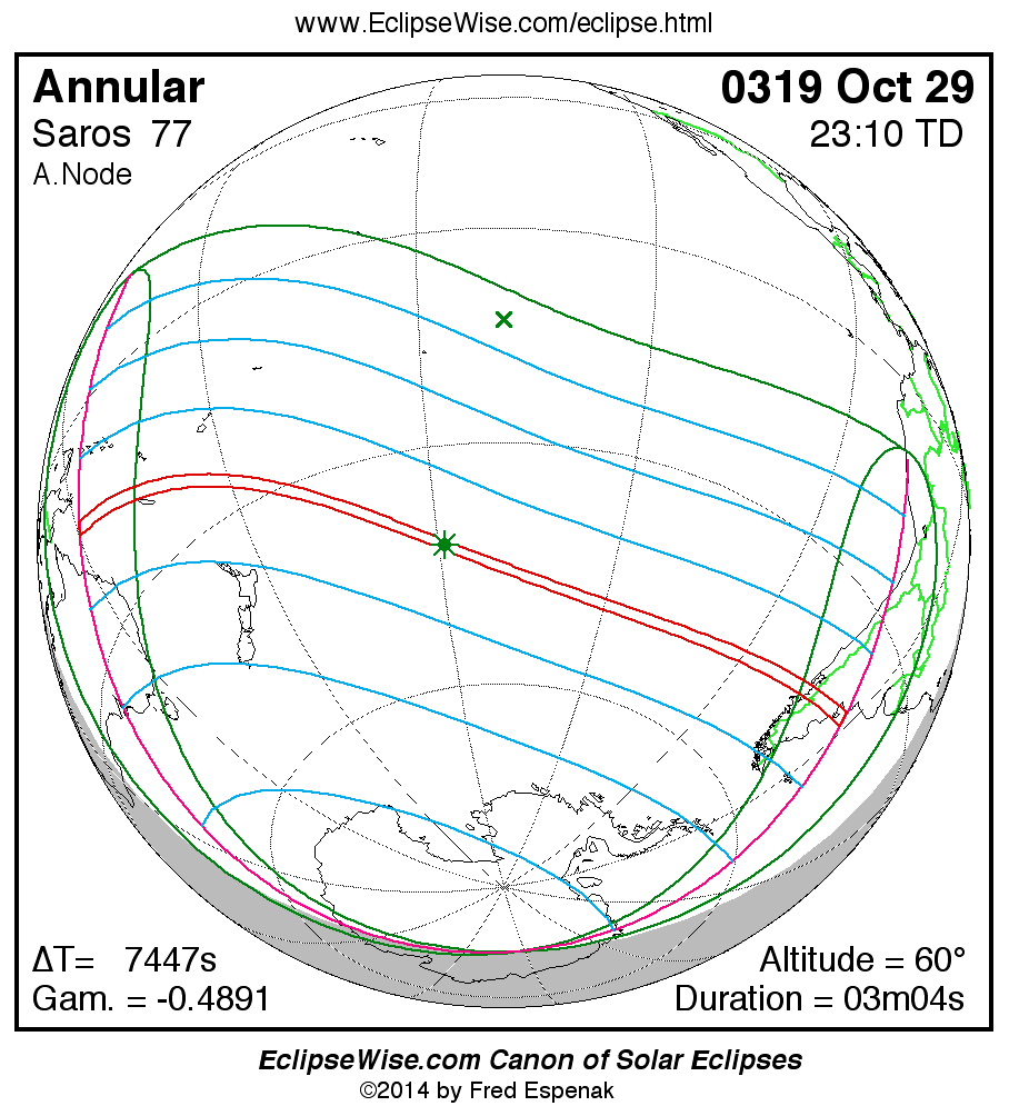 The instant of greatest eclipse takes place on 0319 Oct 29 at 23:09:56 TD (21:05:50 UT1).