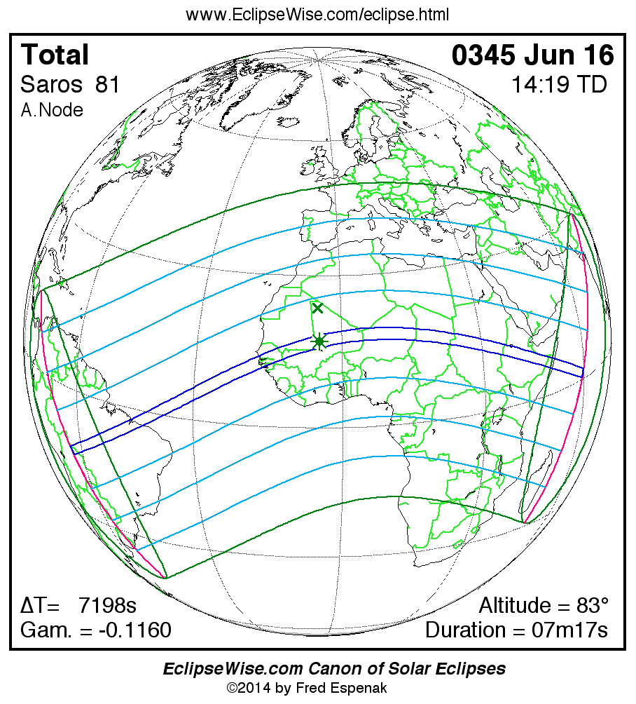- Orthographic Map: Total Solar Eclipse of 0345 Jun 16 - global map of eclipse visibility