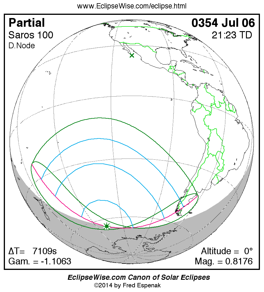 The instant of greatest eclipse takes place on 0354 Jul 06 at 21:23:27 TD (19:24:59 UT1).