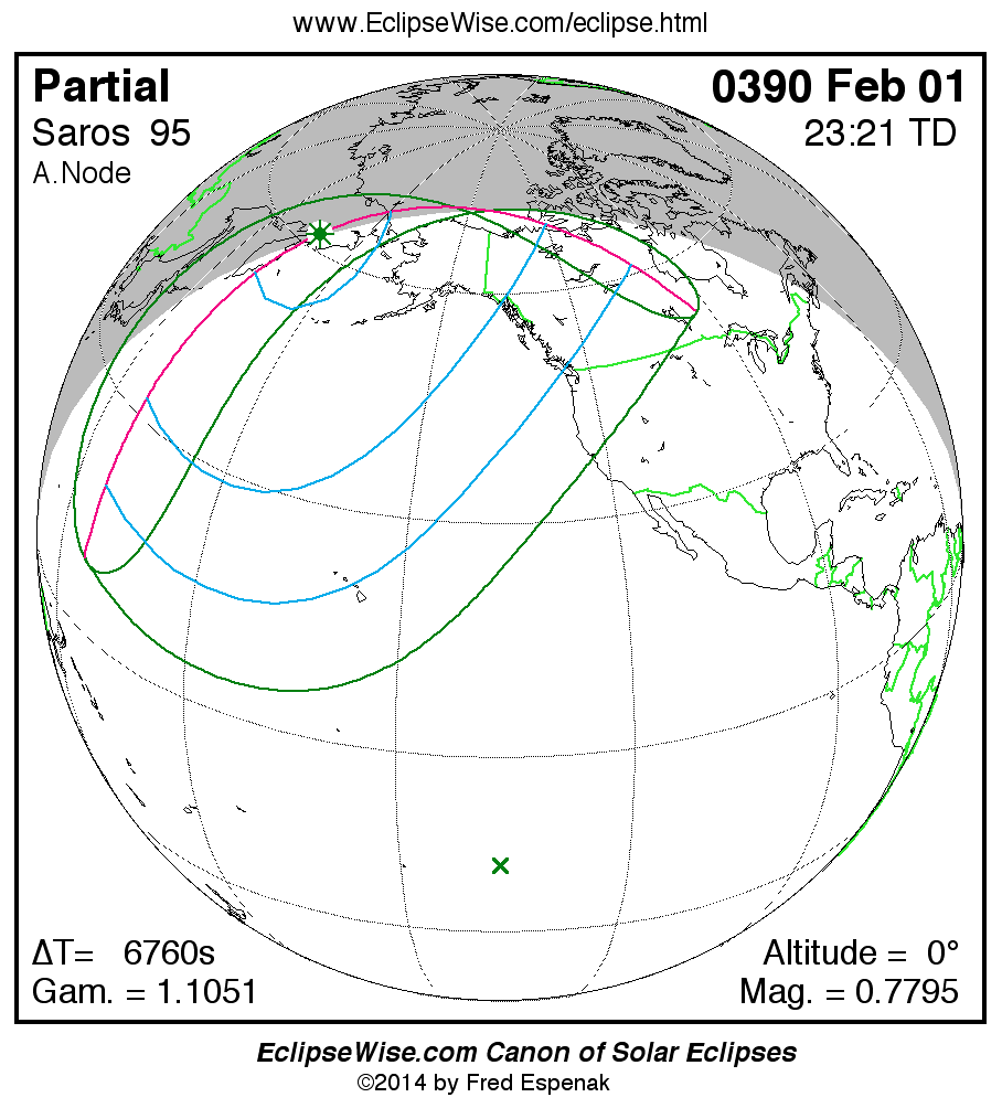 The instant of greatest eclipse takes place on 0390 Feb 01 at 23:20:46 TD (21:28:08 UT1).
