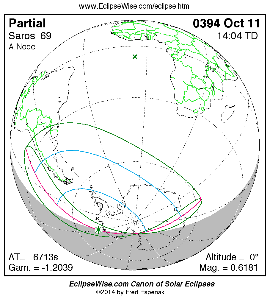 The instant of greatest eclipse takes place on 0394 Oct 11 at 14:03:50 TD (12:11:57 UT1).