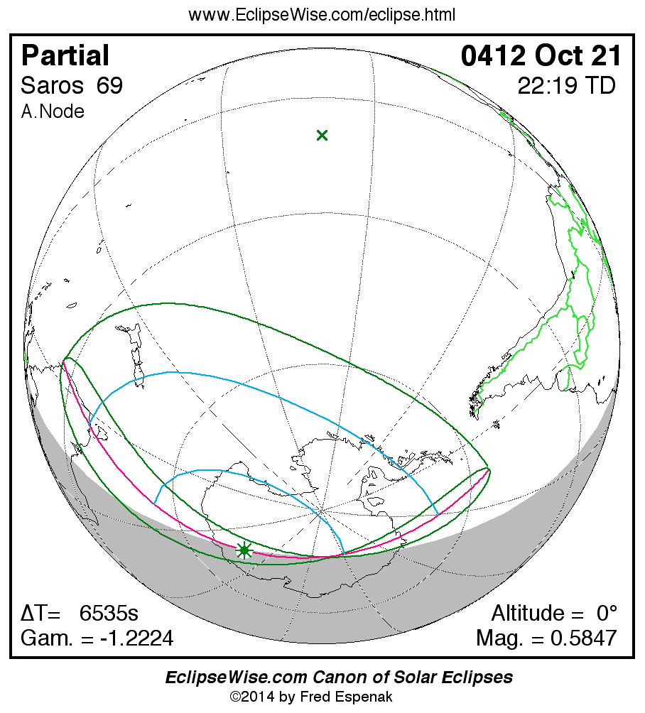 The instant of greatest eclipse takes place on 0412 Oct 21 at 22:19:07 TD (20:30:13 UT1).