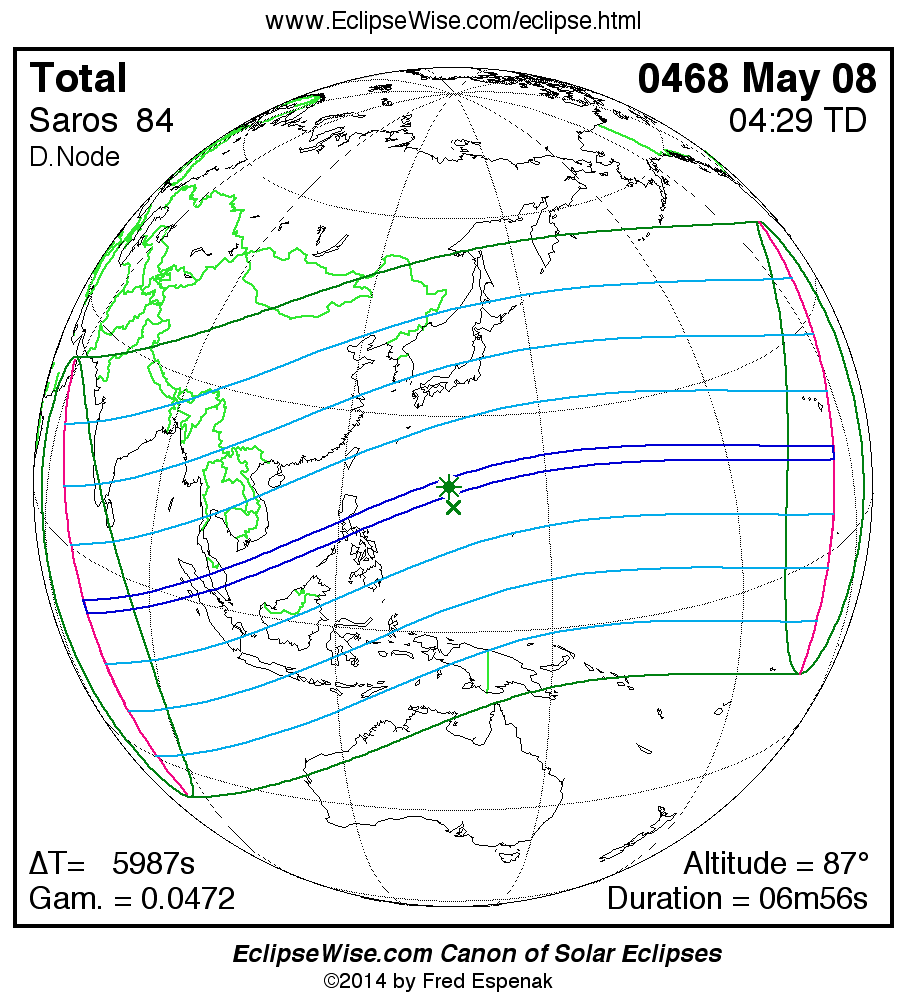 - Path Table: Total Solar Eclipse of 0468 May 08 - coordinates of the central line and path limits