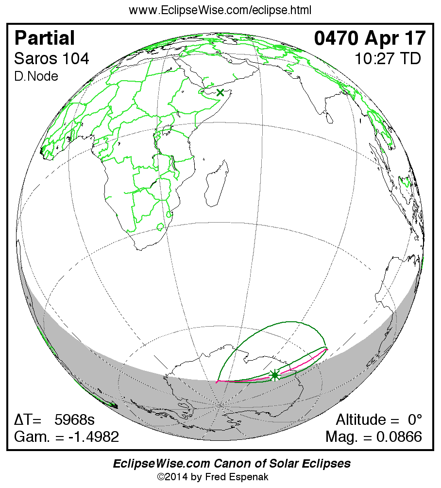 The instant of greatest eclipse takes place on 0470 Apr 17 at 10:26:44 TD (08:47:17 UT1).