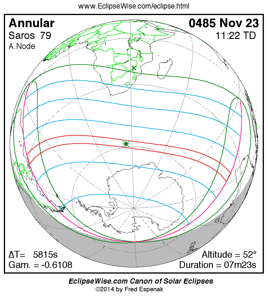 - Path Table: Annular Solar Eclipse of 0485 Nov 23 - coordinates of the central line and path limits