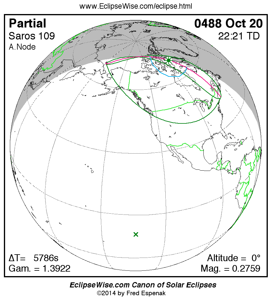 The instant of greatest eclipse takes place on 0488 Oct 20 at 22:21:21 TD (20:44:56 UT1).