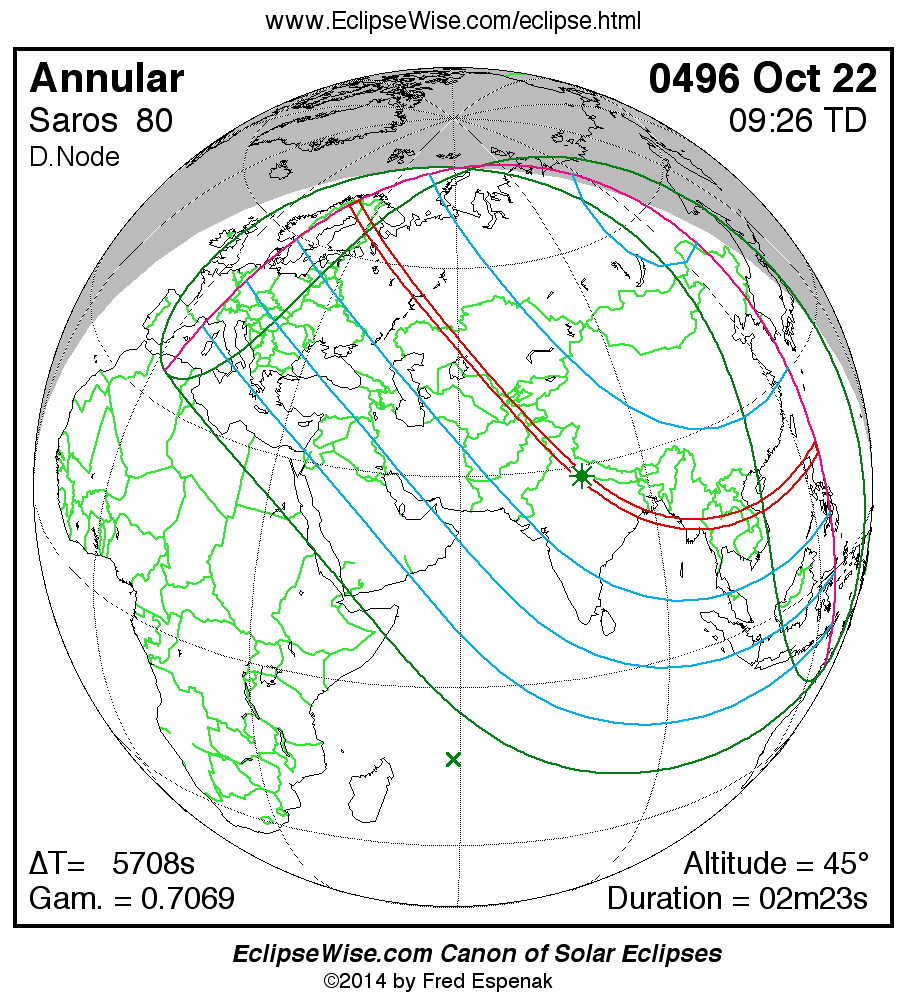 The instant of greatest eclipse takes place on 0496 Oct 22 at 09:26:15 TD (07:51:07 UT1).