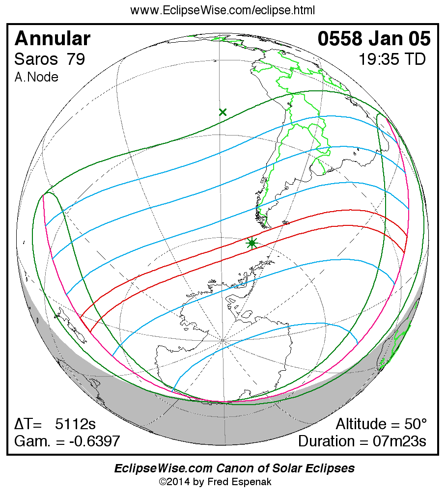 - Path Table: Annular Solar Eclipse of 0558 Jan 05 - coordinates of the central line and path limits