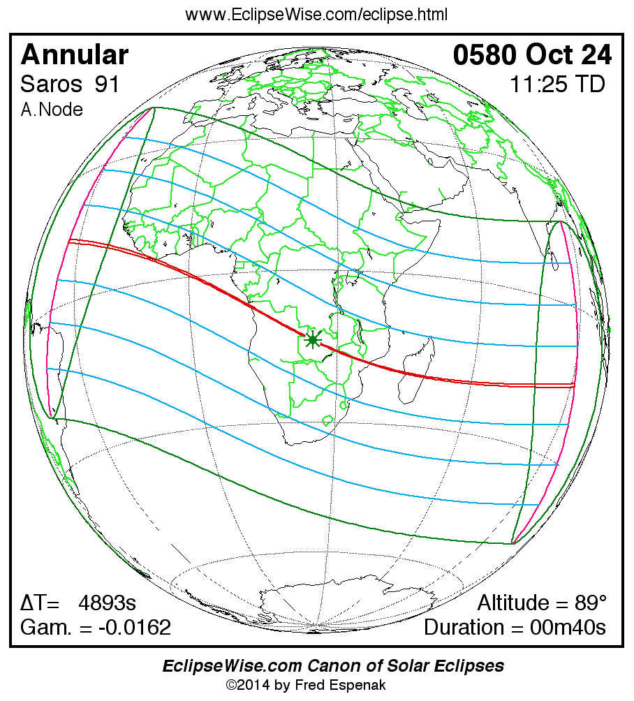 The instant of greatest eclipse takes place on 0580 Oct 24 at 11:25:24 TD (10:03:51 UT1).