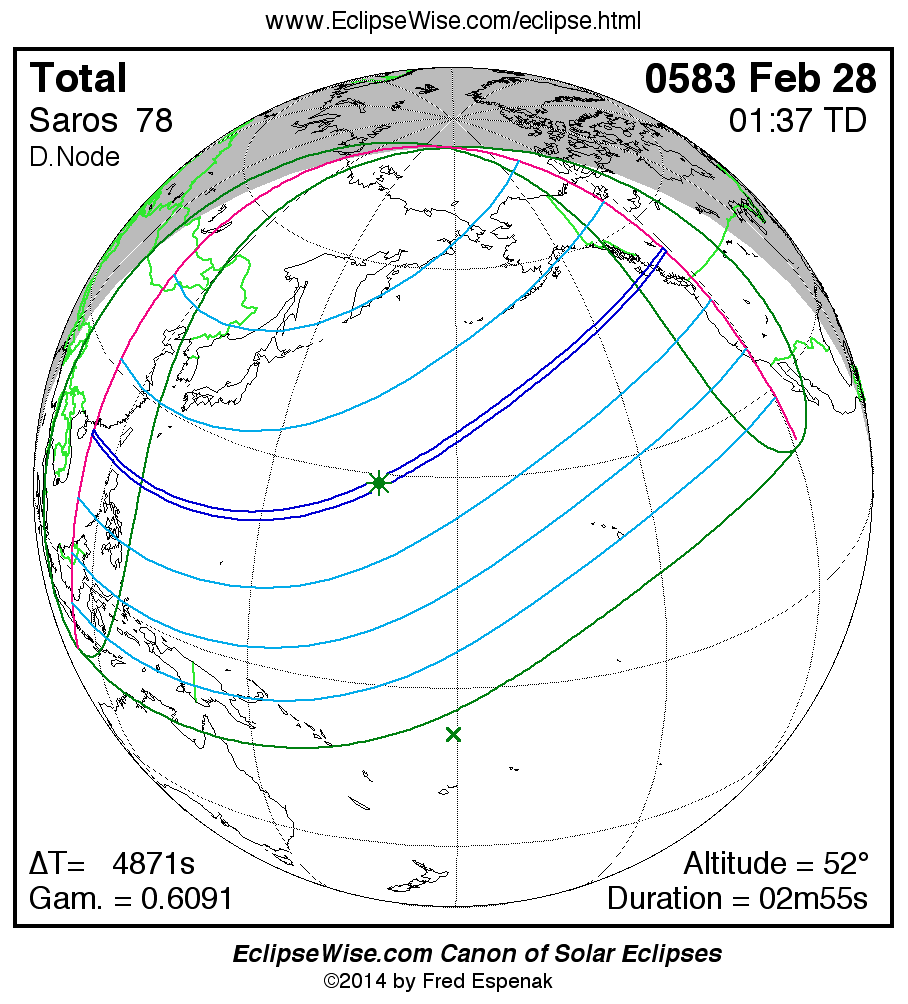 The instant of greatest eclipse takes place on 0583 Feb 28 at 01:37:20 TD (00:16:10 UT1).