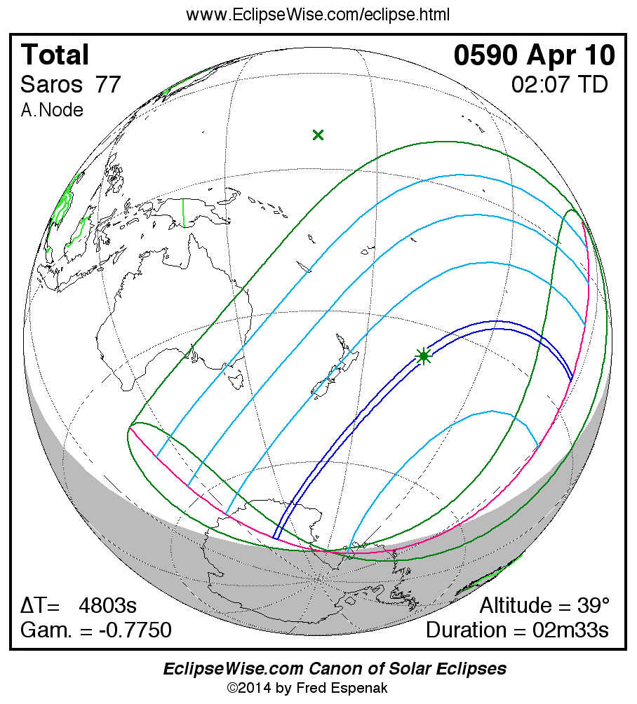 The instant of greatest eclipse takes place on 0590 Apr 10 at 02:06:30 TD (00:46:28 UT1).