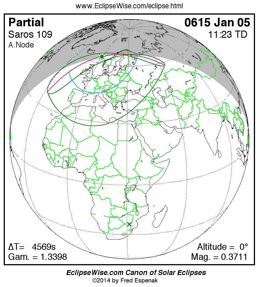 The instant of greatest eclipse takes place on 0615 Jan 05 at 11:22:47 TD (10:06:38 UT1).