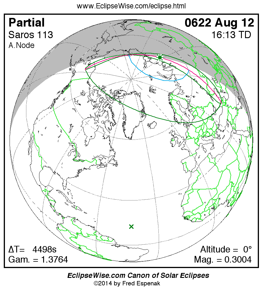 The instant of greatest eclipse takes place on 0622 Aug 12 at 16:12:33 TD (14:57:36 UT1).