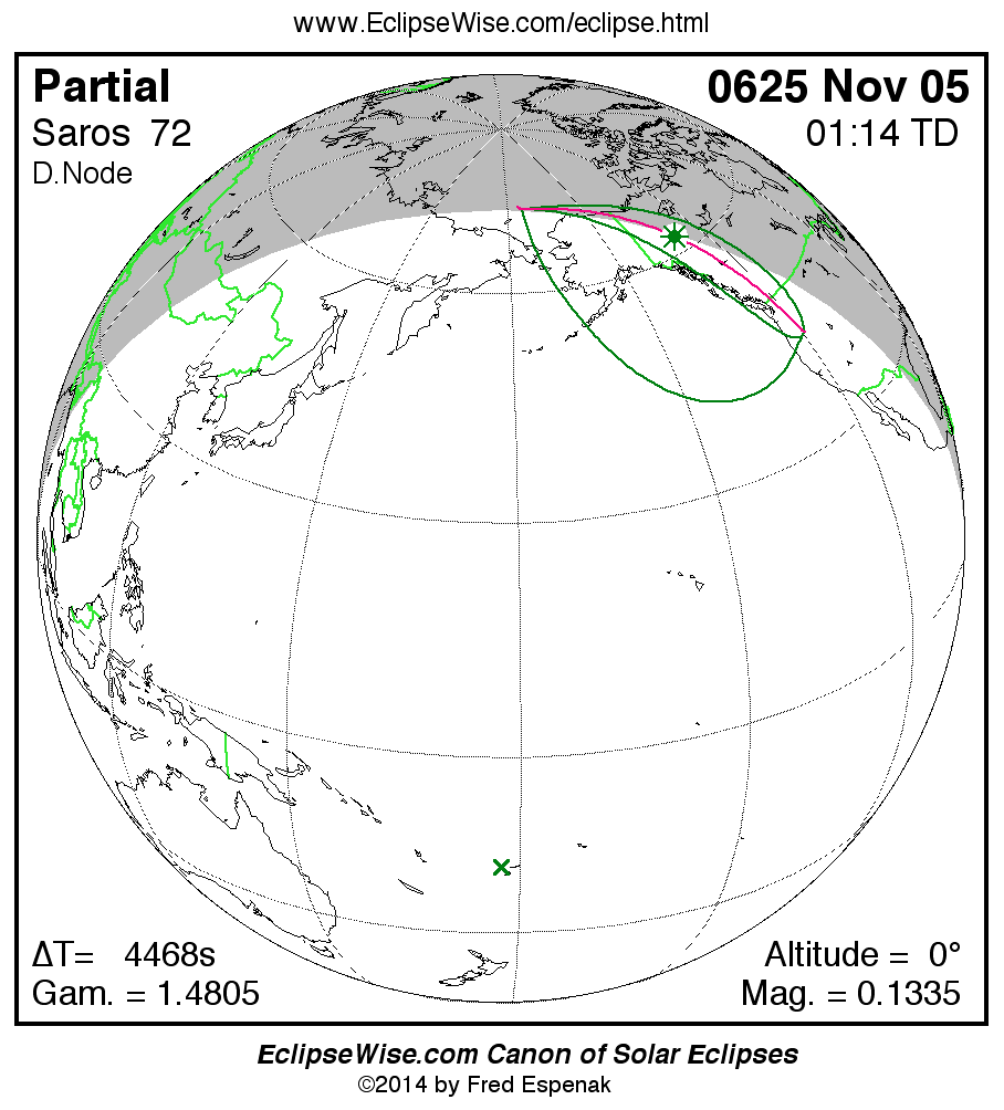 The instant of greatest eclipse takes place on 0625 Nov 06 at 01:13:51 TD (23:59:24 UT1).