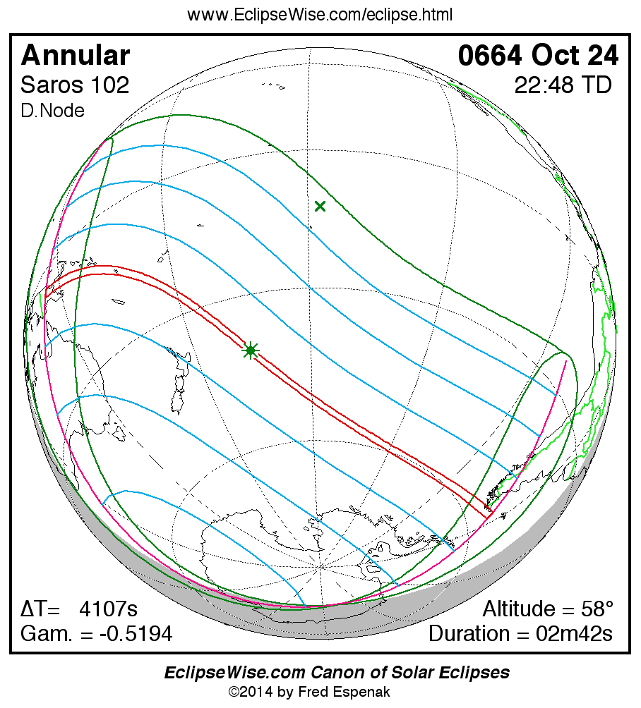 The instant of greatest eclipse takes place on 0664 Oct 24 at 22:47:37 TD (21:39:11 UT1).