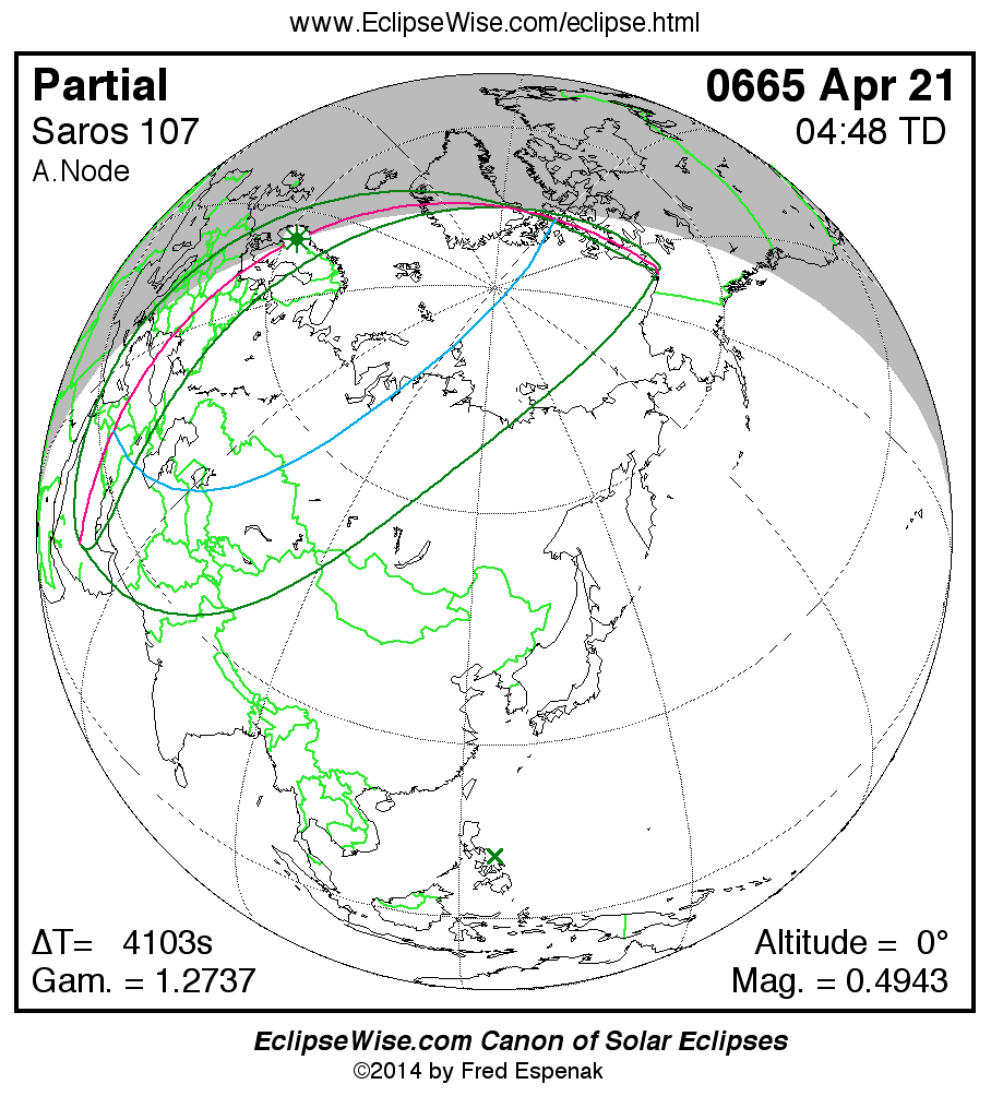The instant of greatest eclipse takes place on 0665 Apr 21 at 04:47:52 TD (03:39:30 UT1).