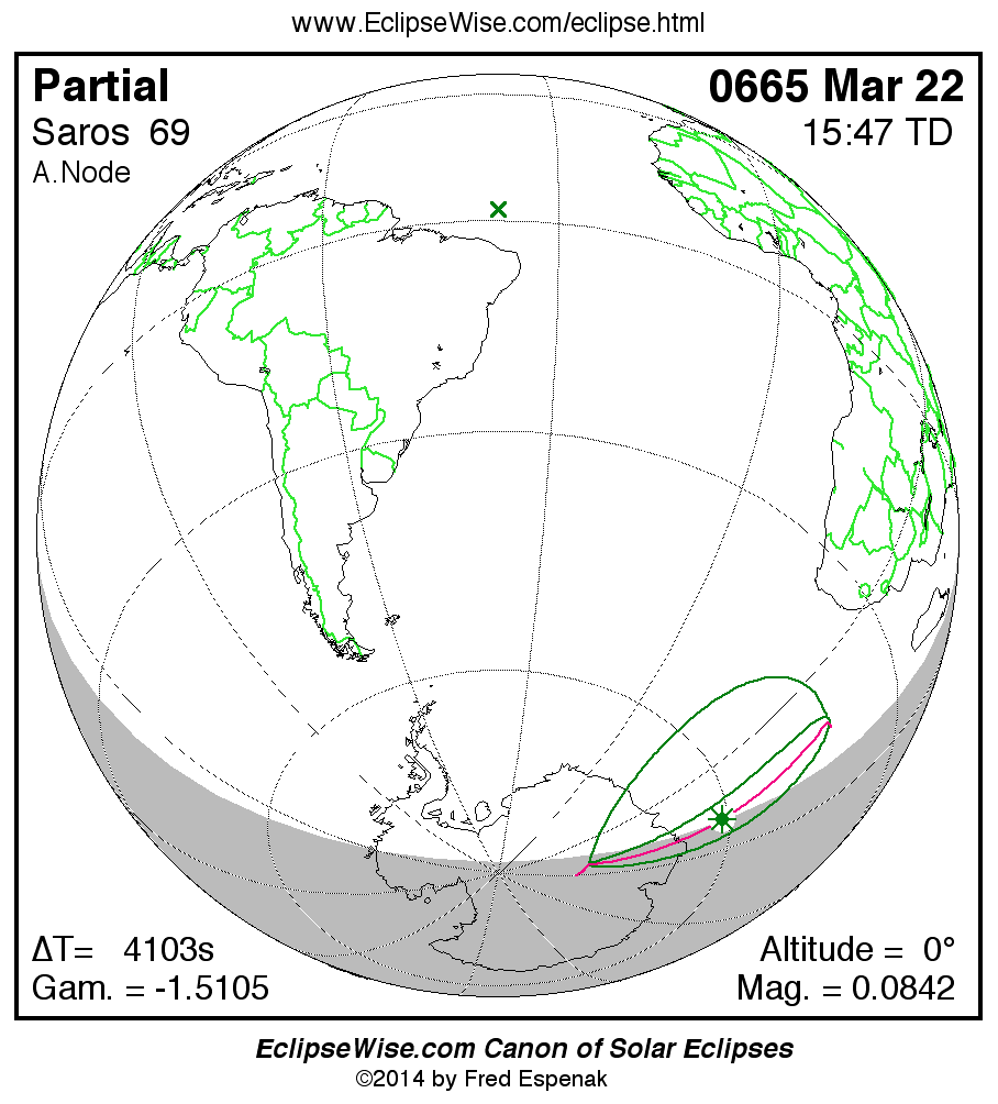 The instant of greatest eclipse takes place on 0665 Mar 22 at 15:47:11 TD (14:38:48 UT1).