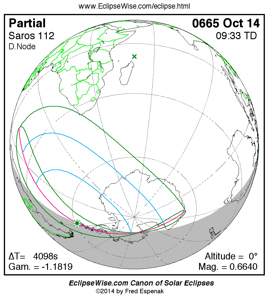 The instant of greatest eclipse takes place on 0665 Oct 14 at 09:33:14 TD (08:24:57 UT1).