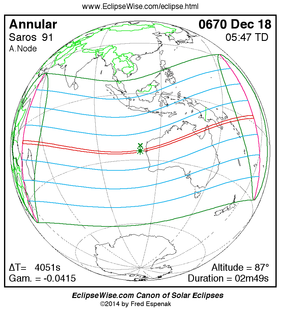The instant of greatest eclipse takes place on 0670 Dec 18 at 05:46:37 TD (04:39:06 UT1).