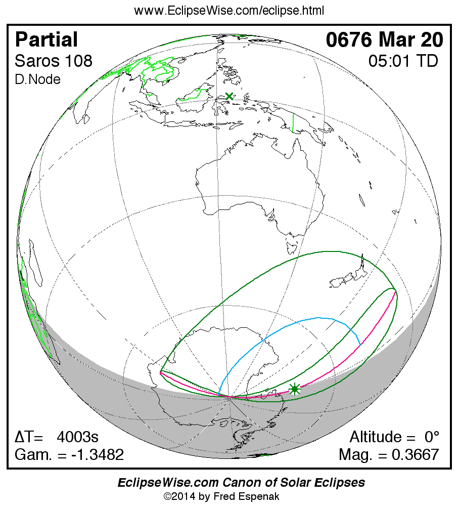 The instant of greatest eclipse takes place on 0676 Mar 20 at 05:00:34 TD (03:53:52 UT1).