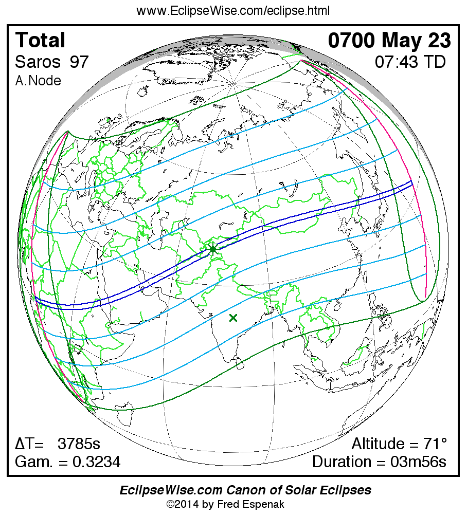 The instant of greatest eclipse takes place on 0700 May 23 at 07:42:40 TD (06:39:36 UT1).