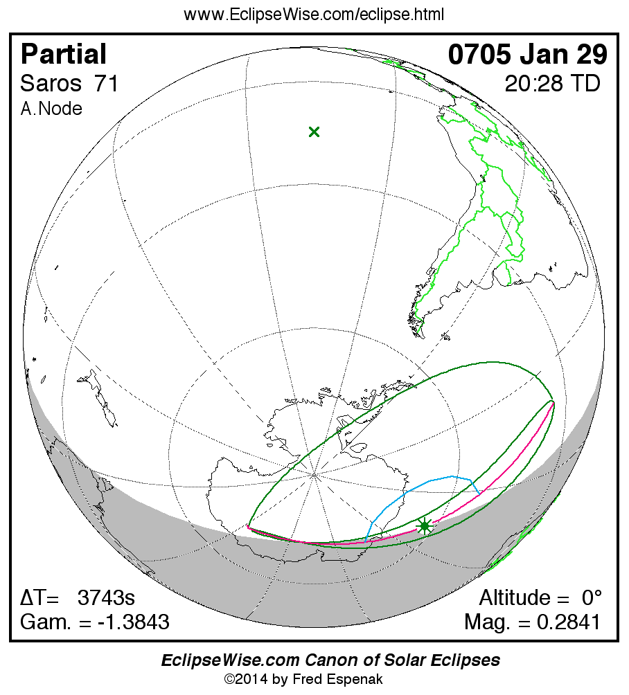 The instant of greatest eclipse takes place on 0705 Jan 29 at 20:27:31 TD (19:25:08 UT1).