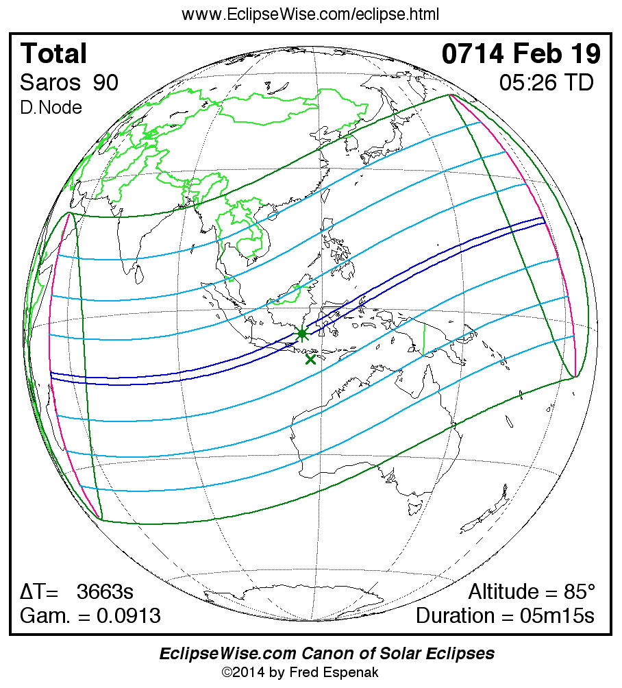 - Orthographic Map: Total Solar Eclipse of 0714 Feb 19 - global map of eclipse visibility