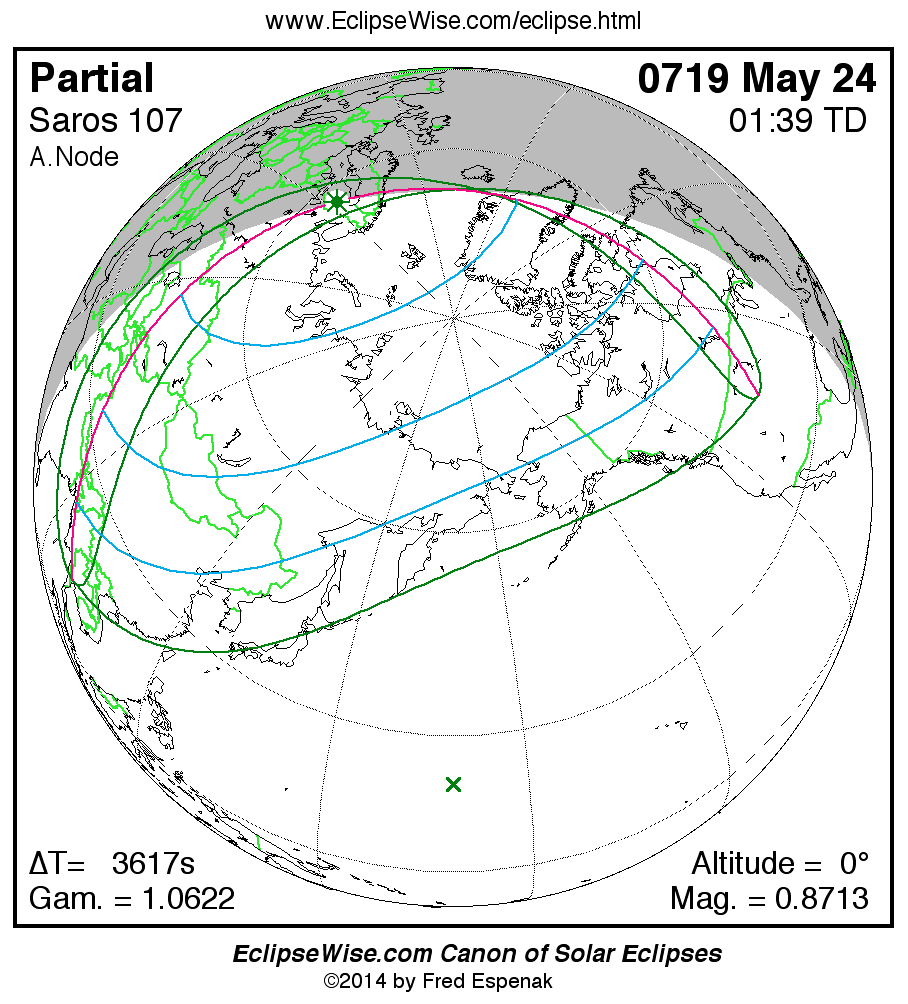 The instant of greatest eclipse takes place on 0719 May 24 at 01:39:03 TD (00:38:47 UT1).
