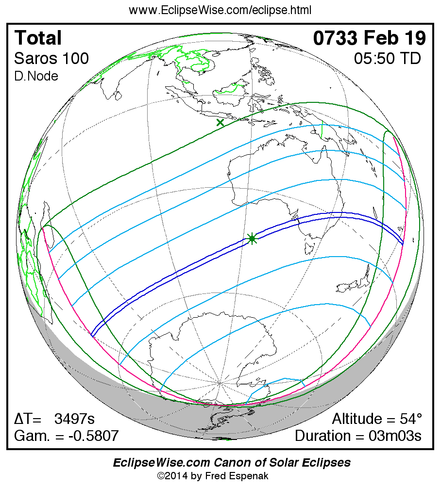 The instant of greatest eclipse takes place on 0733 Feb 19 at 05:50:24 TD (04:52:08 UT1).