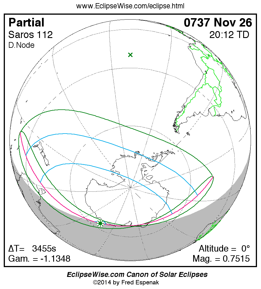 The partial solar eclipse of 0737 Nov 26 is preceded two weeks earlier by a total lunar eclipse on 0737 Nov 12.