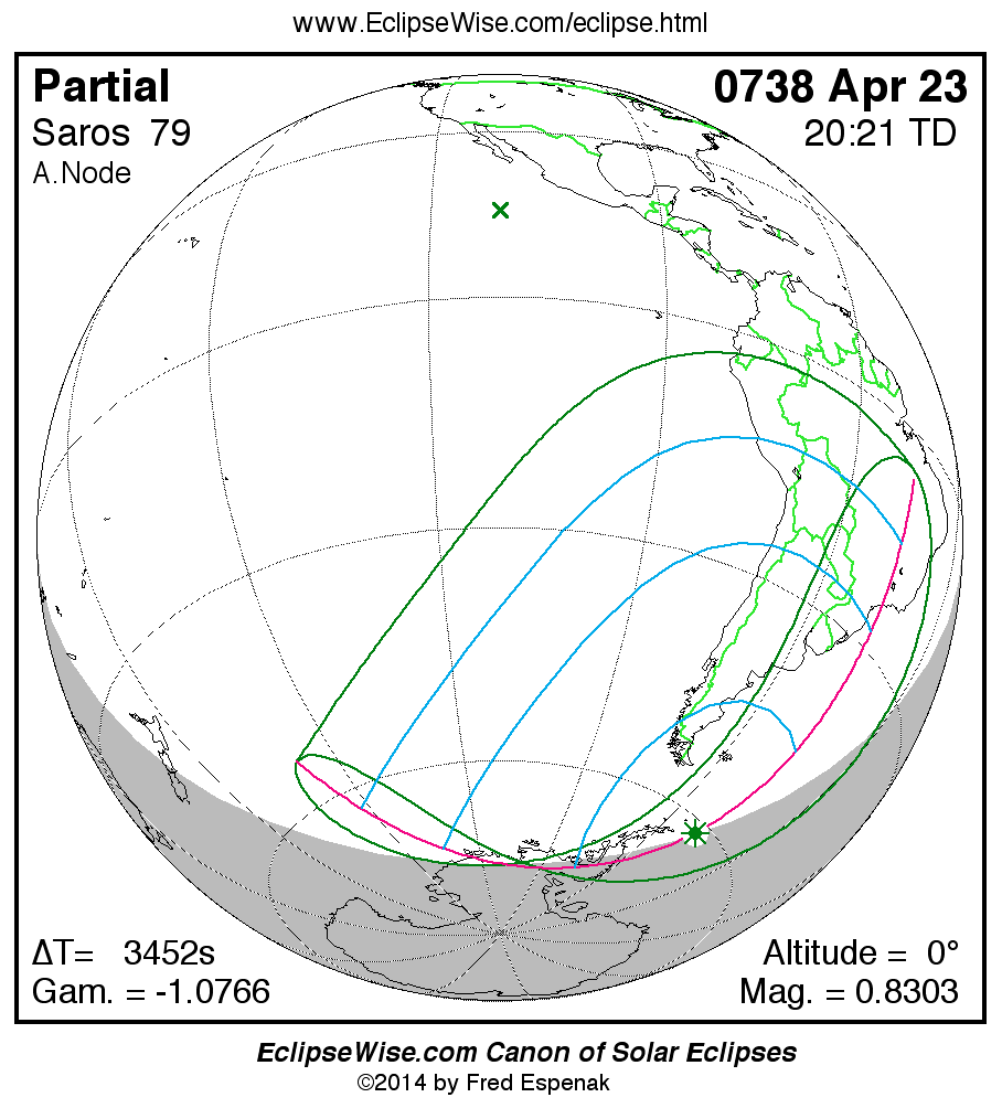 The instant of greatest eclipse takes place on 0738 Apr 23 at 20:21:24 TD (19:23:53 UT1).