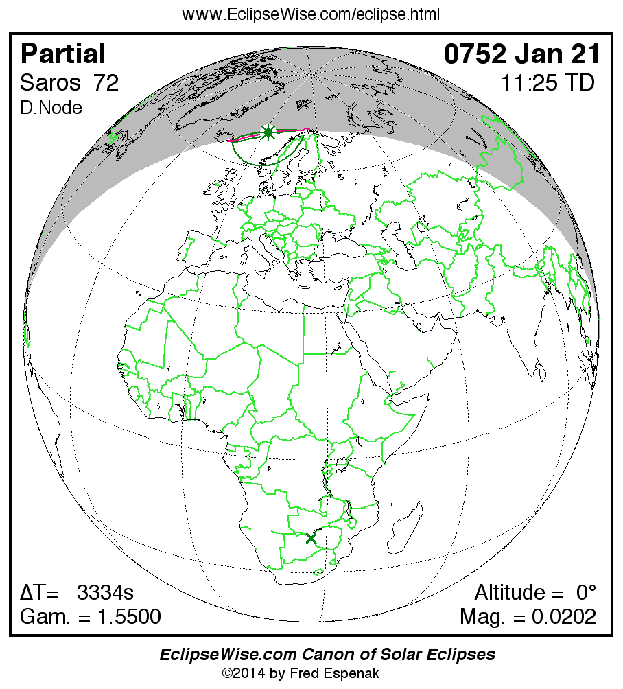- Orthographic Map: Partial Solar Eclipse of 0752 Jan 21 - global map of eclipse visibility