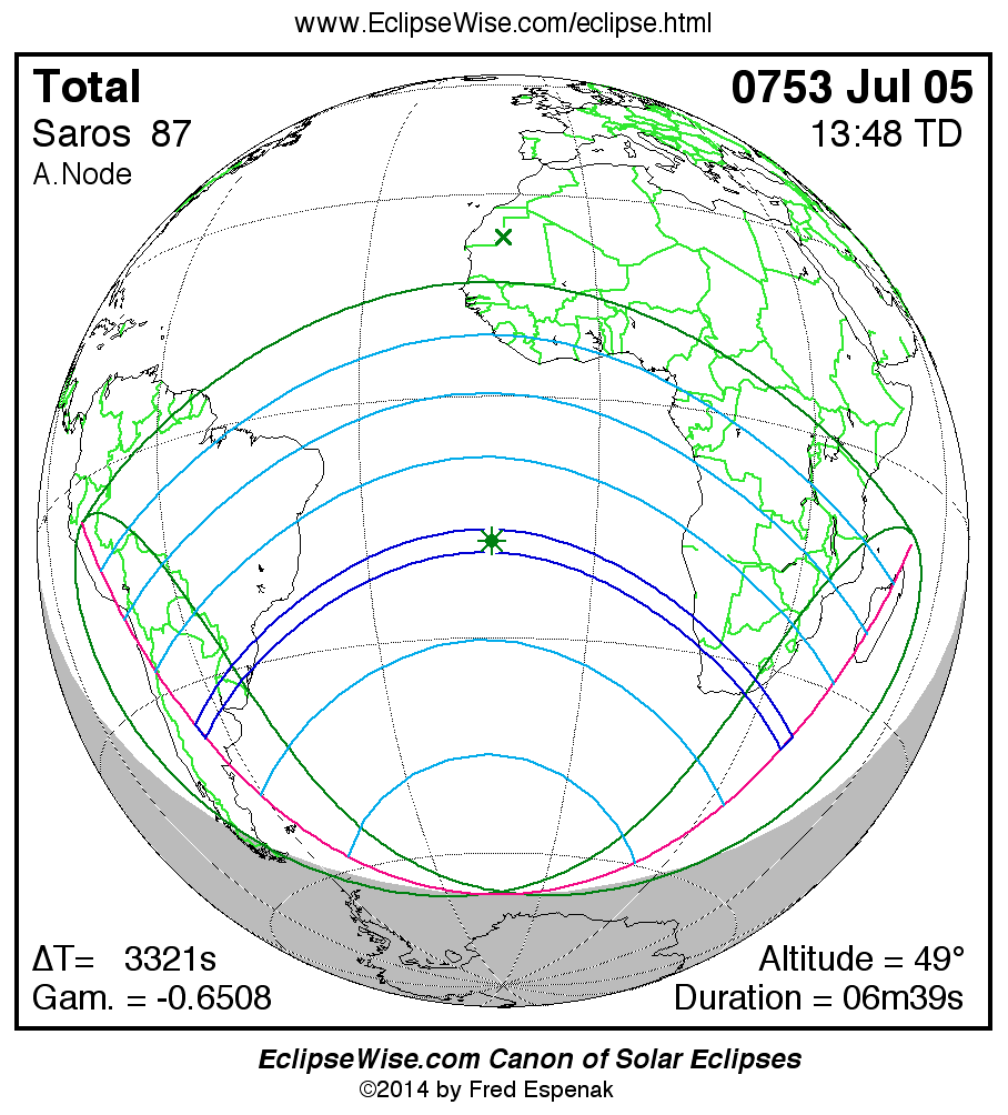 - Orthographic Map: Total Solar Eclipse of 0753 Jul 05 - global map of eclipse visibility