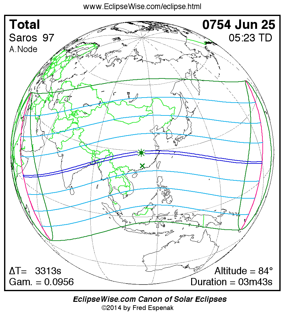 The instant of greatest eclipse takes place on 0754 Jun 25 at 05:23:06 TD (04:27:53 UT1).