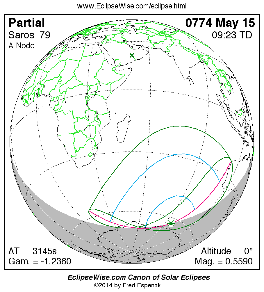 The instant of greatest eclipse takes place on 0774 May 15 at 09:22:50 TD (08:30:25 UT1).