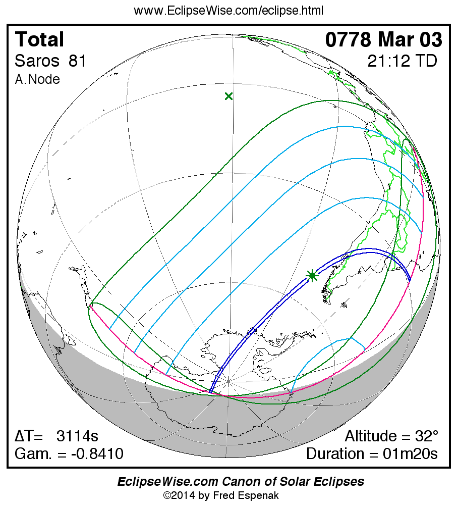 The instant of greatest eclipse takes place on 0778 Mar 03 at 21:12:16 TD (20:20:23 UT1).