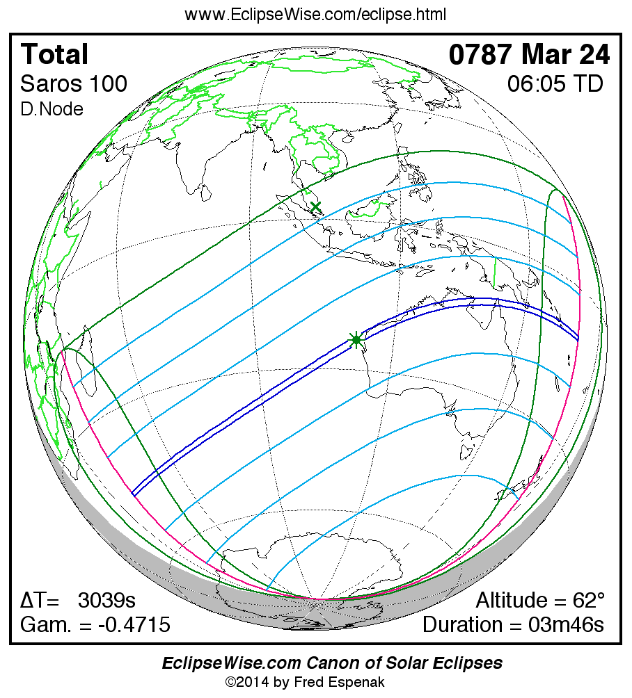 The instant of greatest eclipse takes place on 0787 Mar 24 at 06:04:53 TD (05:14:14 UT1).