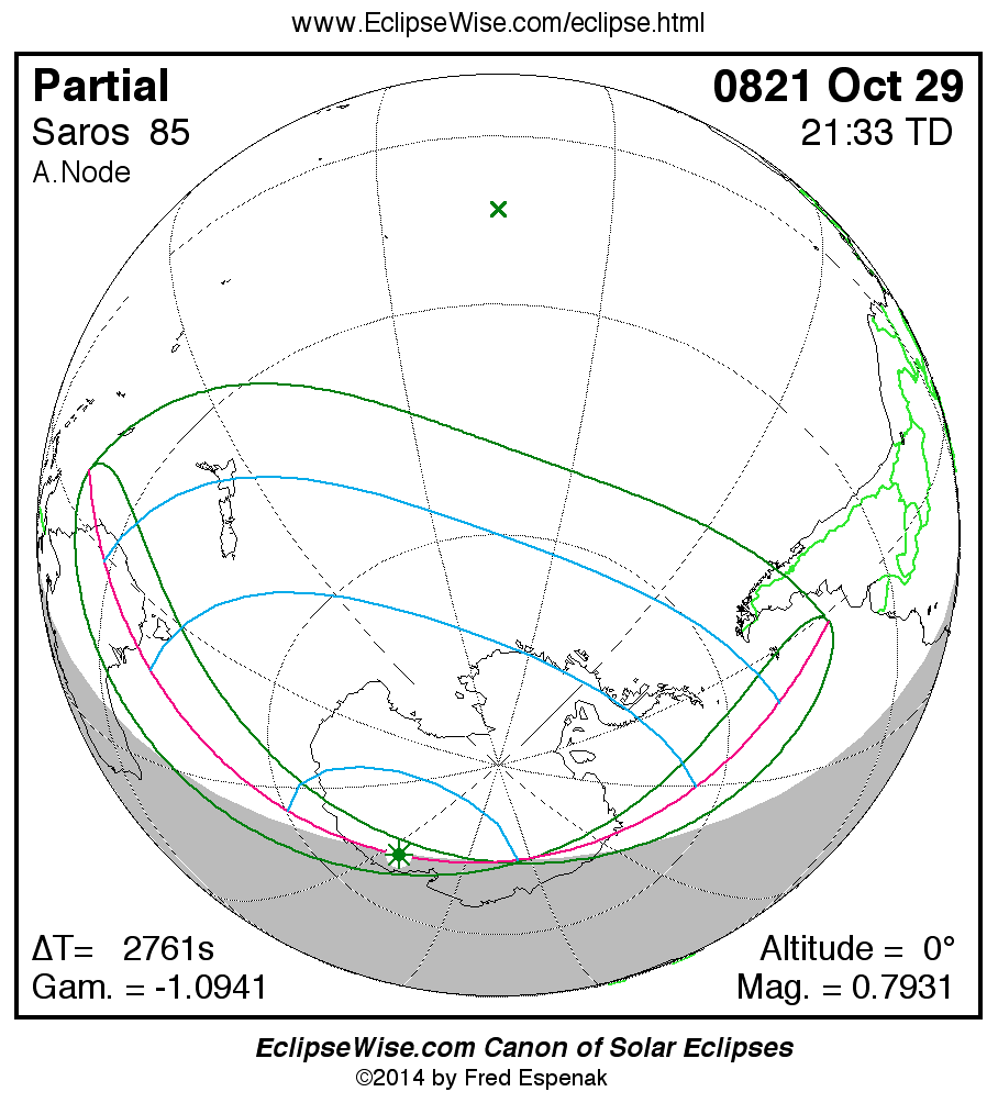 The instant of greatest eclipse takes place on 0821 Oct 29 at 21:33:10 TD (20:47:10 UT1).