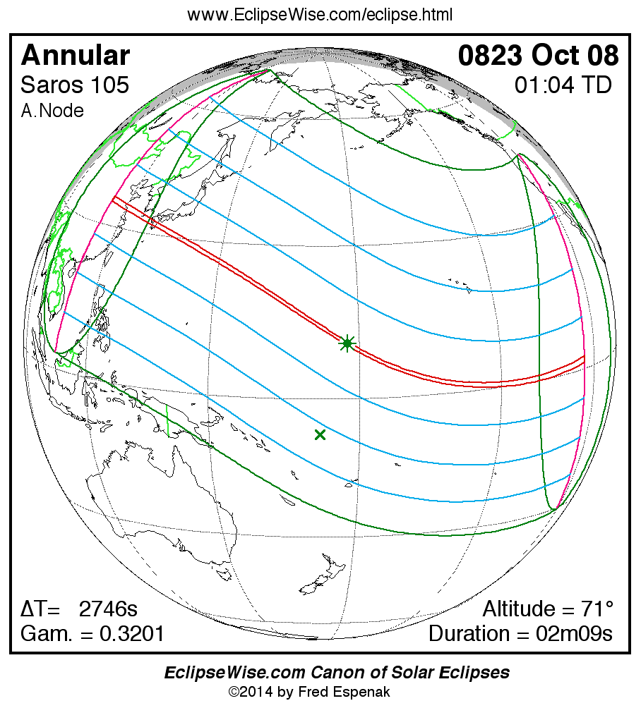 The instant of greatest eclipse takes place on 0823 Oct 08 at 01:03:57 TD (00:18:12 UT1).