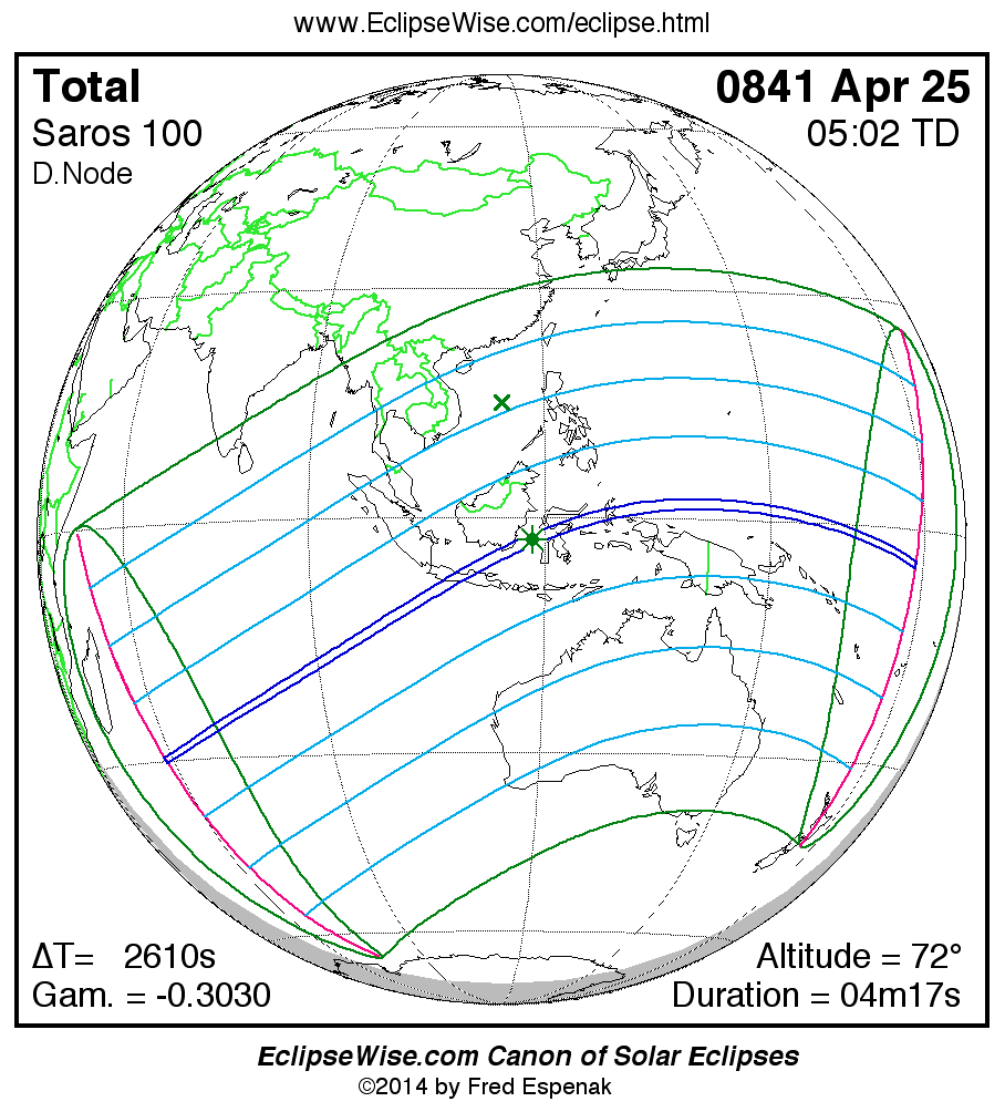 - Orthographic Map: Total Solar Eclipse of 0841 Apr 25 - global map of eclipse visibility