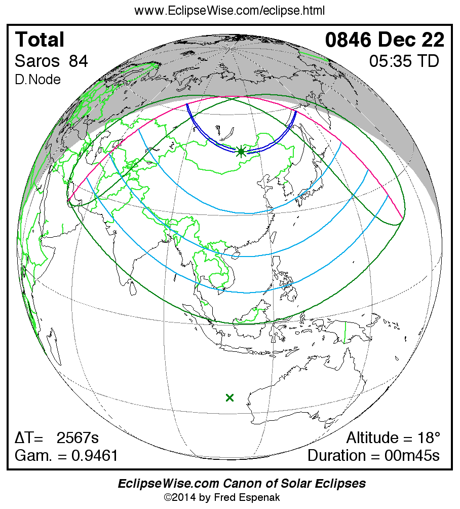 The instant of greatest eclipse takes place on 0846 Dec 22 at 05:34:45 TD (04:51:58 UT1).