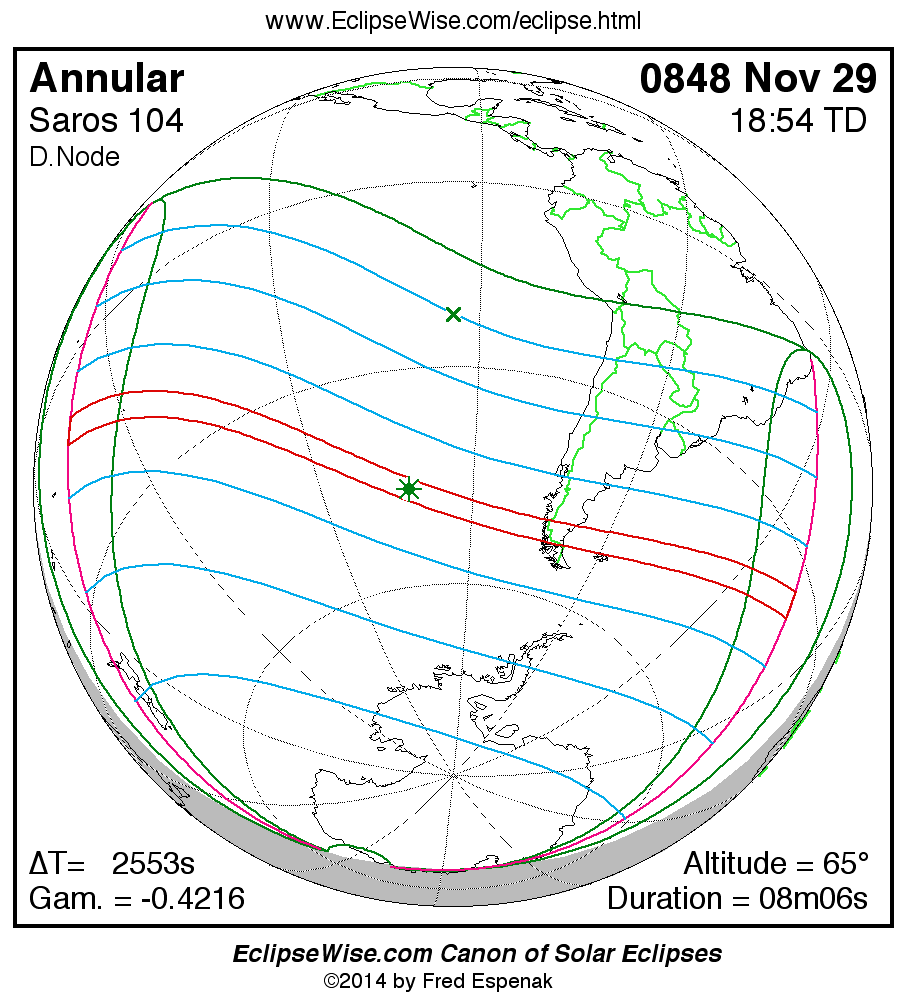 - Orthographic Map: Annular Solar Eclipse of 0848 Nov 29 - global map of eclipse visibility