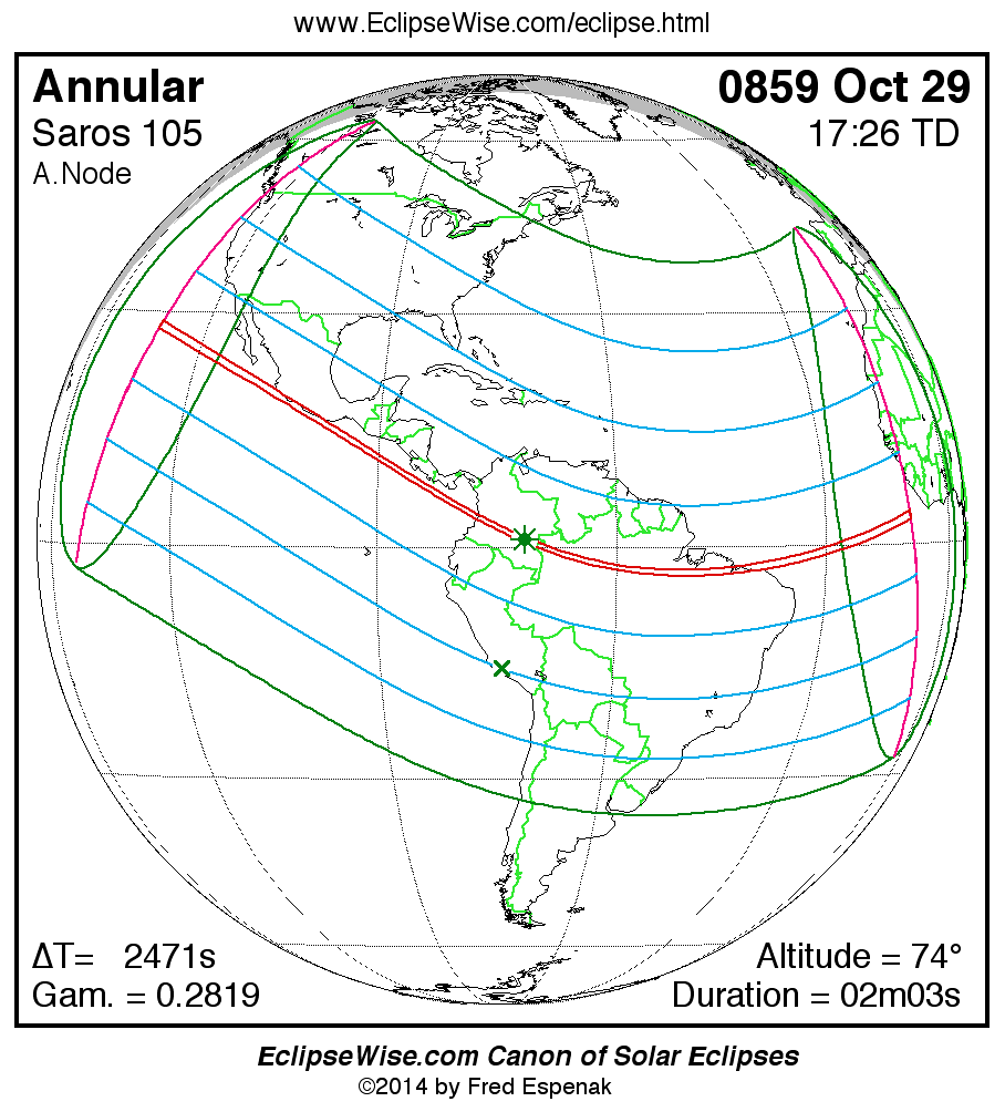 The annular solar eclipse of 0859 Oct 29 is preceded two weeks earlier by a penumbral lunar eclipse on 0859 Oct 15.