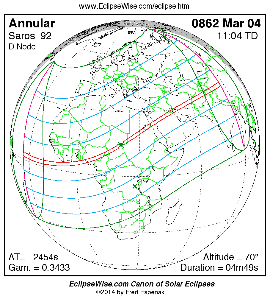 The instant of greatest eclipse takes place on 0862 Mar 04 at 11:03:31 TD (10:22:38 UT1).